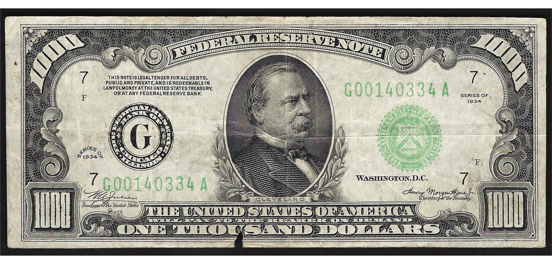 One 1934 $1,000 Federal Reserve Note Chicago.