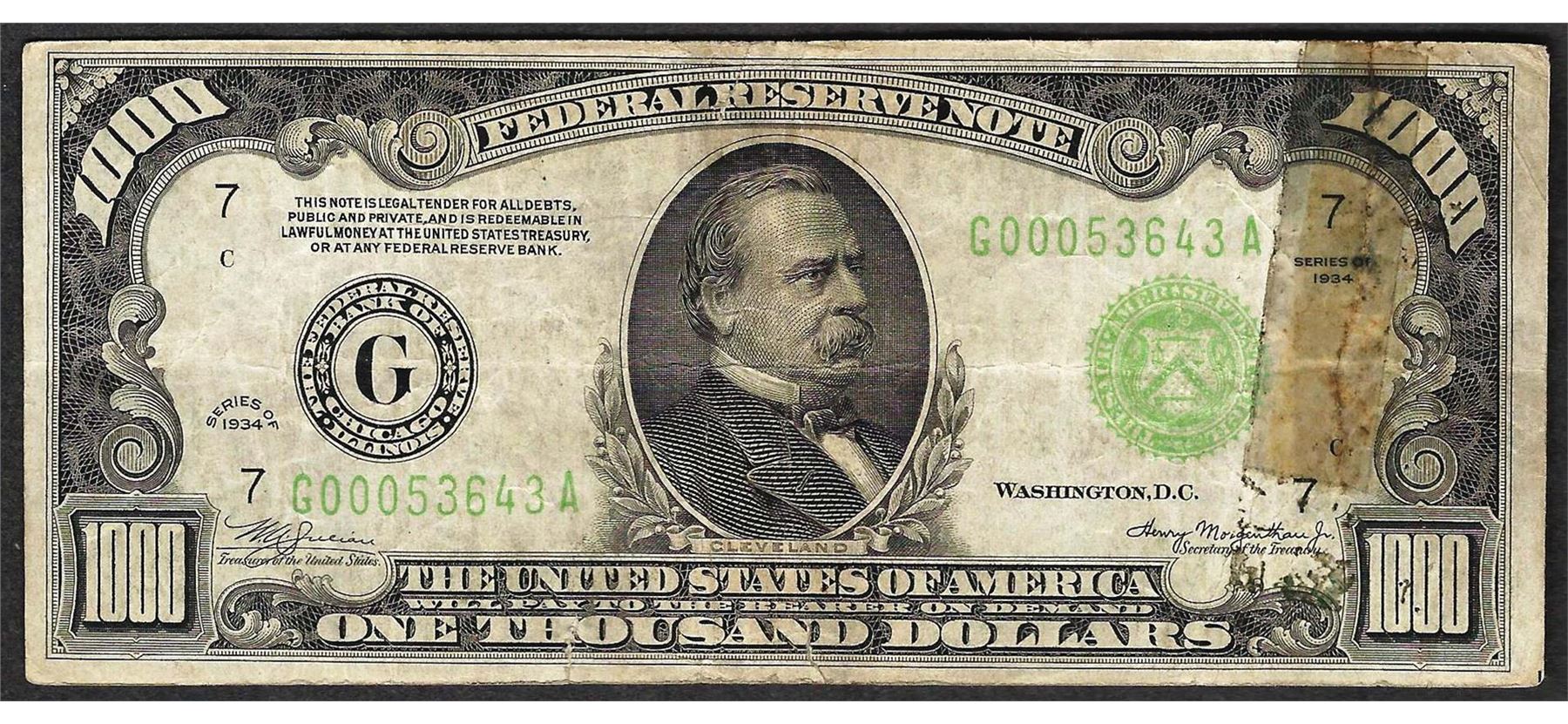 One 1934 $1,000 Federal Reserve Note Chicago.