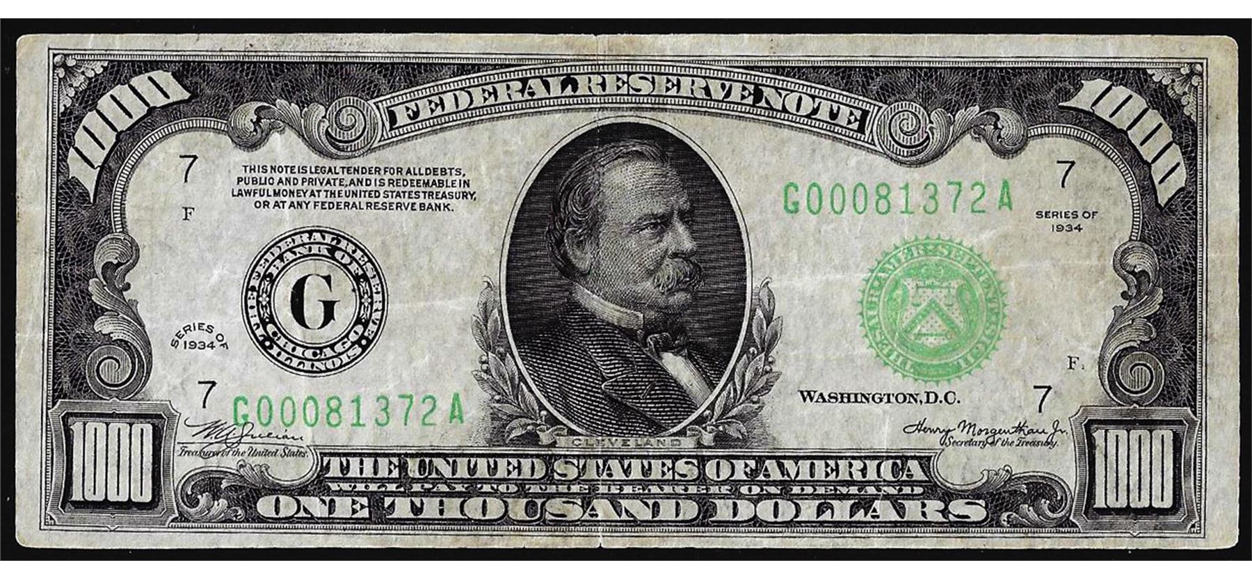 One 1934 $1,000 Federal Reserve Note Chicago.