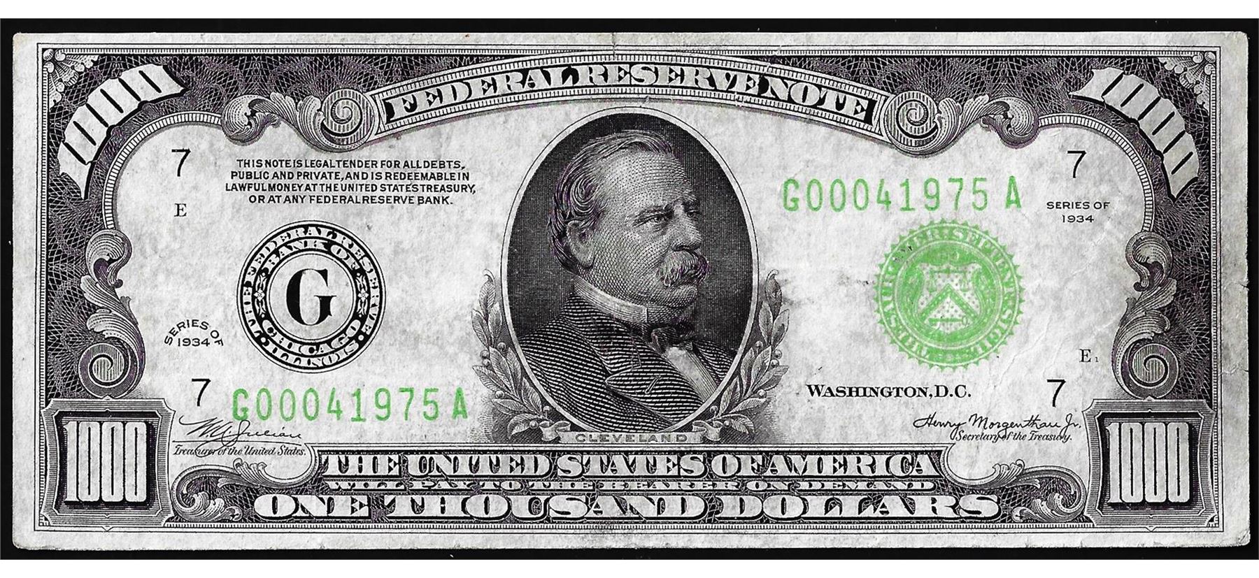 One 1934 $1,000 Federal Reserve Note Chicago.