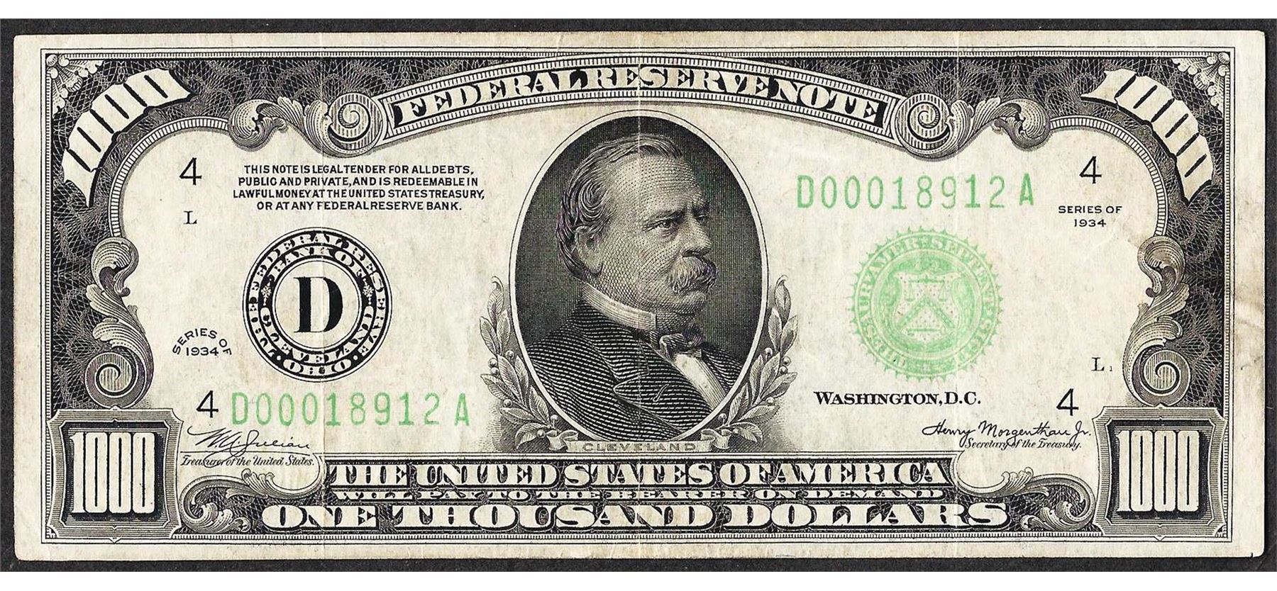 One 1934 $1,000 Federal Reserve Note Cleveland.