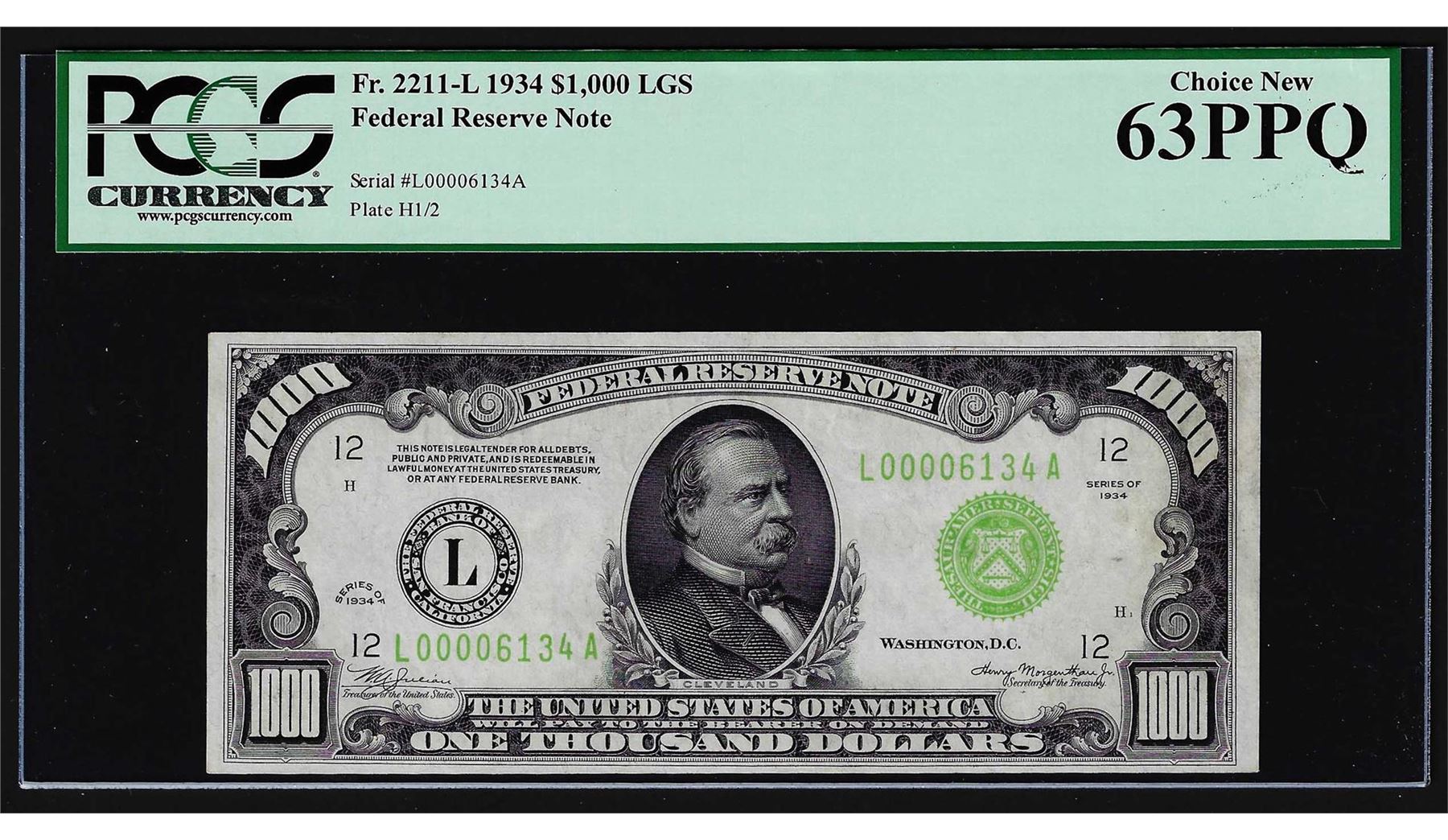 One 1934 $1,000 Federal Reserve Note Light Green Seal Fr. 2211-L PCGS Choice New 63PPQ. PCGS Graded.