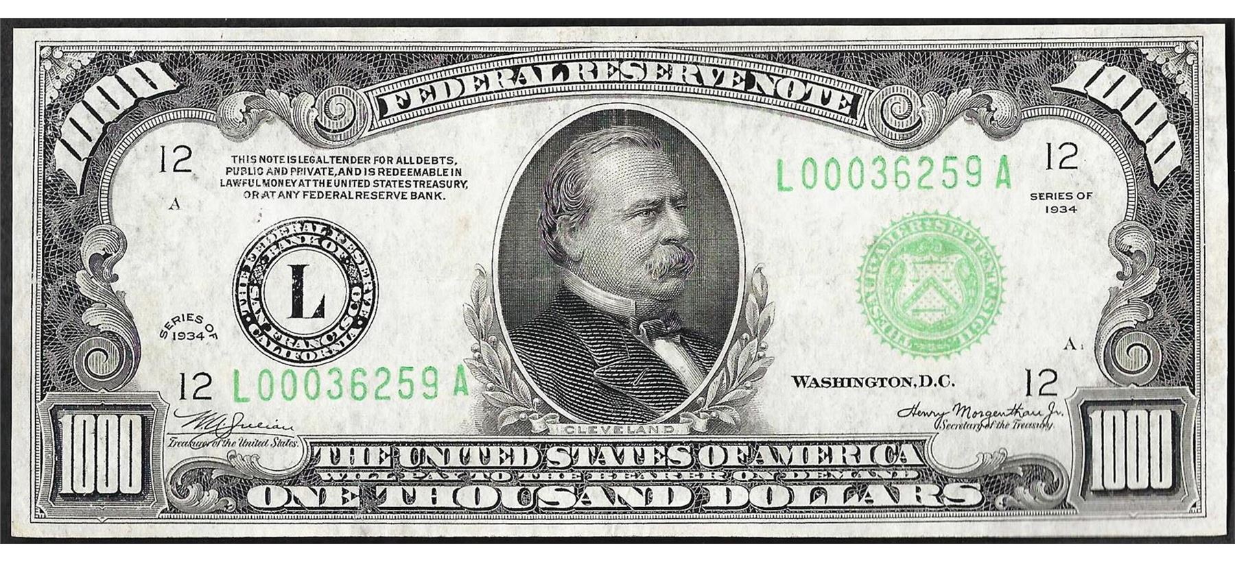 One 1934 $1,000 Federal Reserve Note San Francisco.