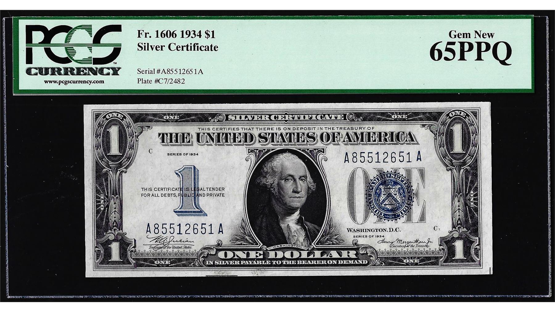 One 1934 $1 Funnyback Silver Certificate Note FR.1606 PCGS Gem New 65PPQ. PCGS Graded.