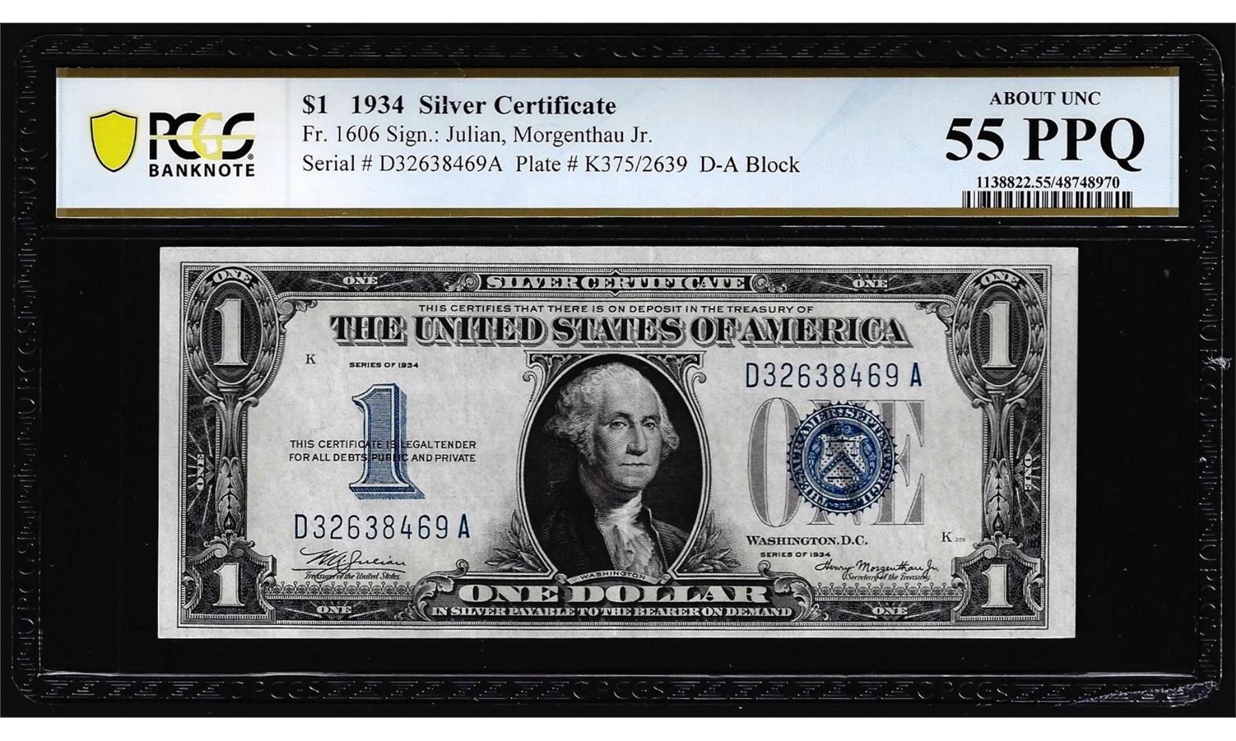1934 $1 Funnyback Silver Certificate Note Fr.1606 PCGS About Uncirculated 55PPQ