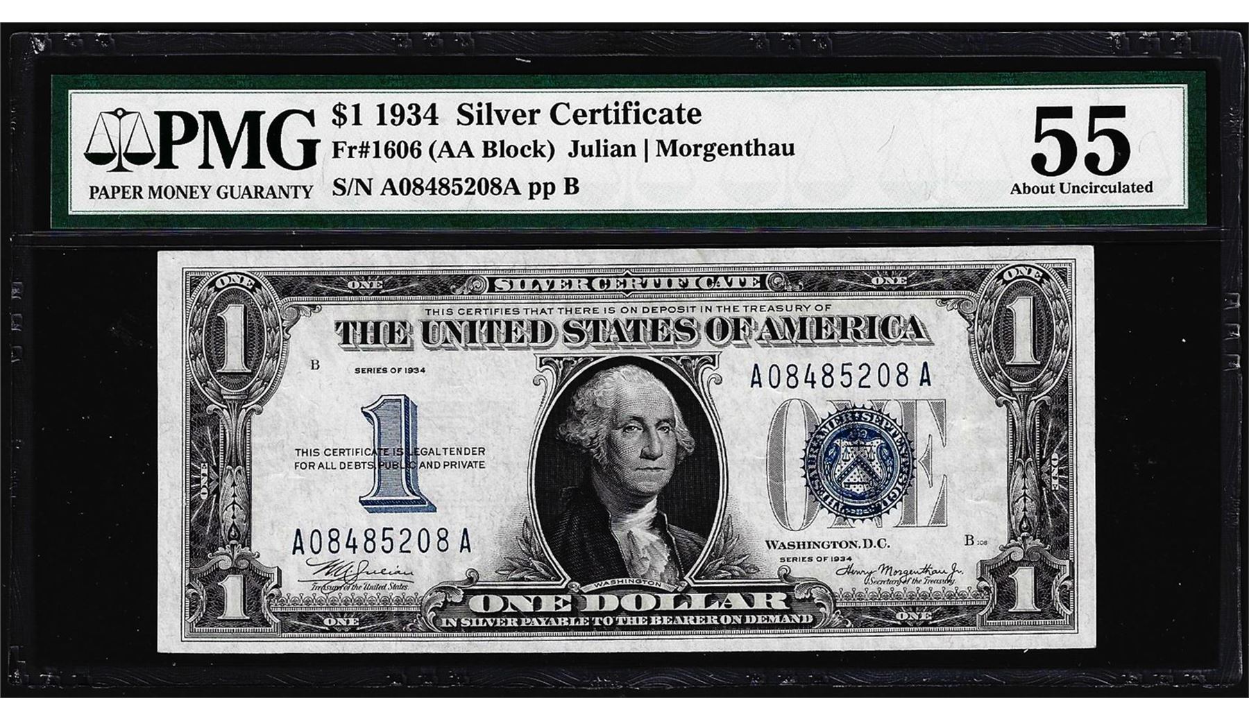 One 1934 $1 Funnyback Silver Certificate Note Fr.1606 PMG About Uncirculated 55. PMG Certified.