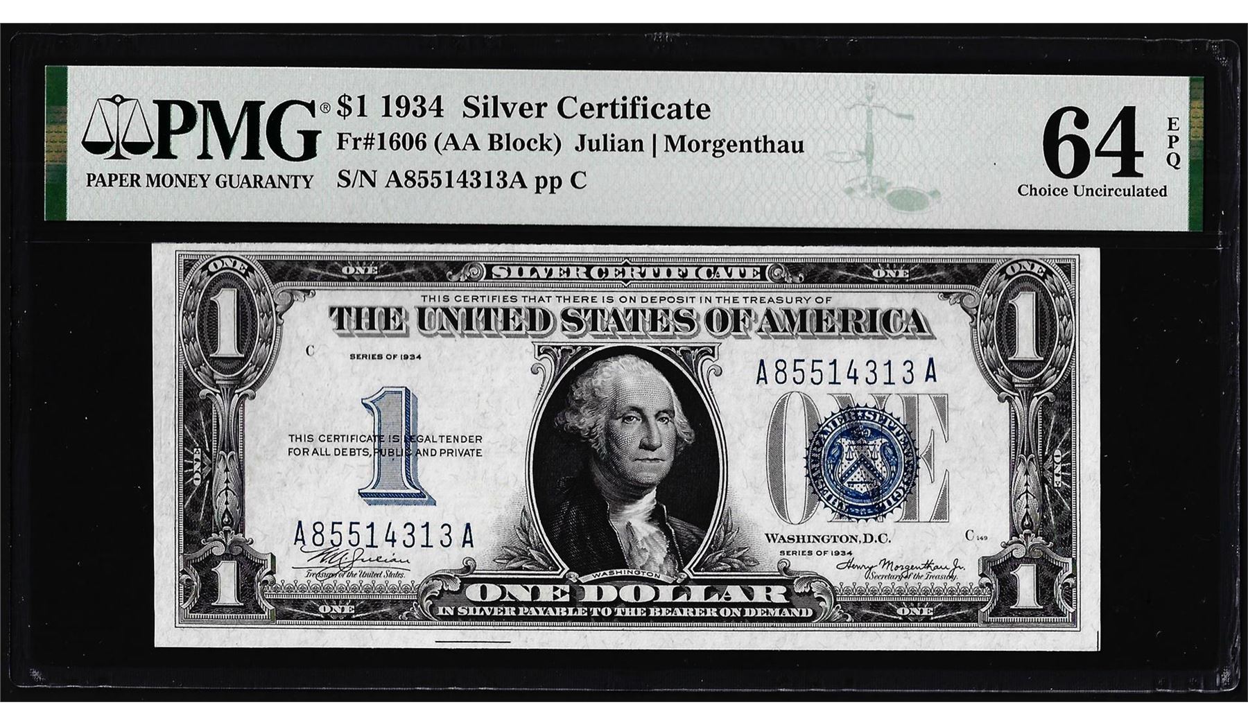 One 1934 $1 Funnyback Silver Certificate Note Fr.1606 PMG Choice Uncirculated 64EPQ. PMG Certified.
