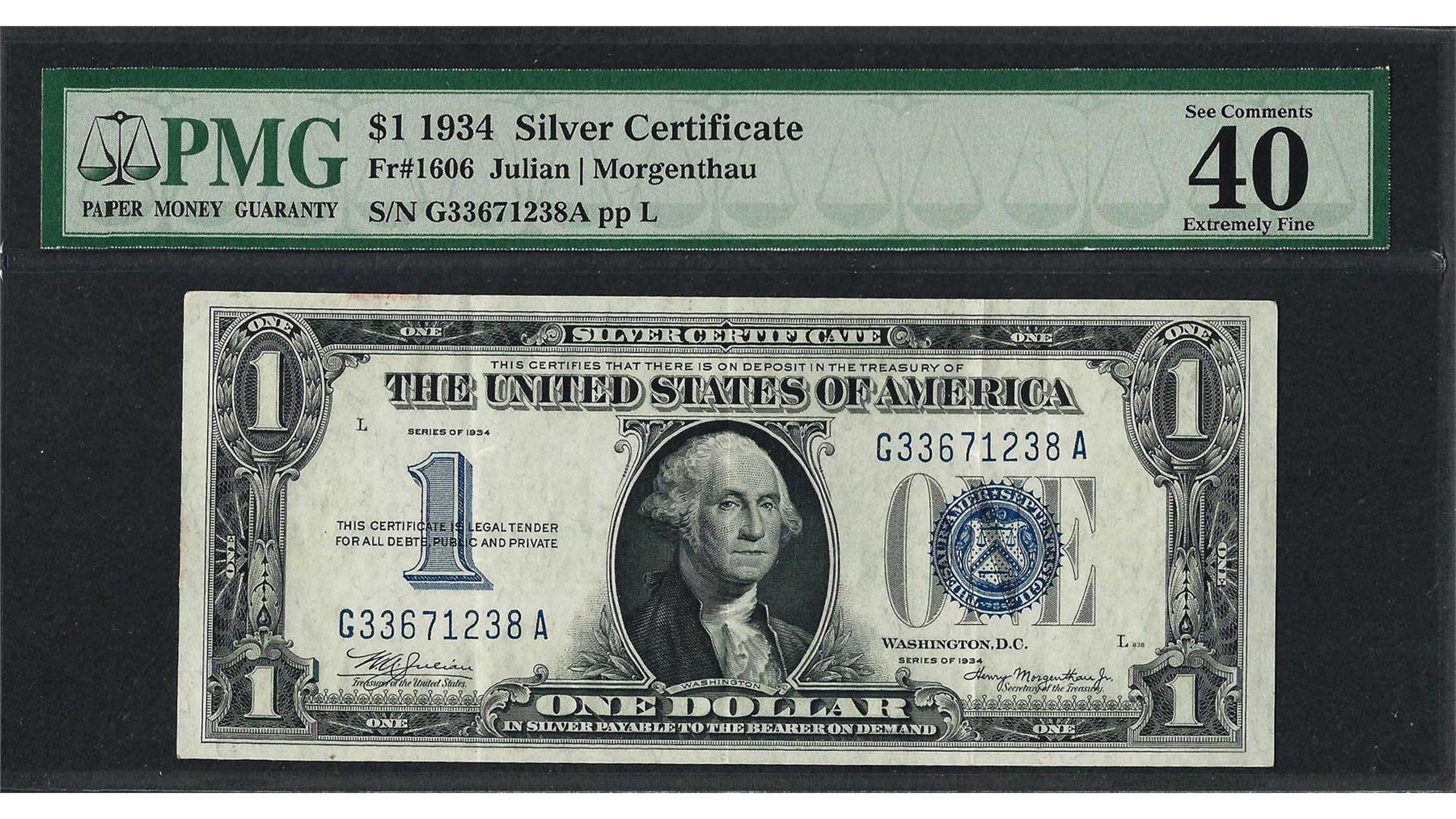 One 1934 $1 Funnyback Silver Certificate Note Fr.1606 PMG Extremely Fine 40EPQ. PMG Certified.