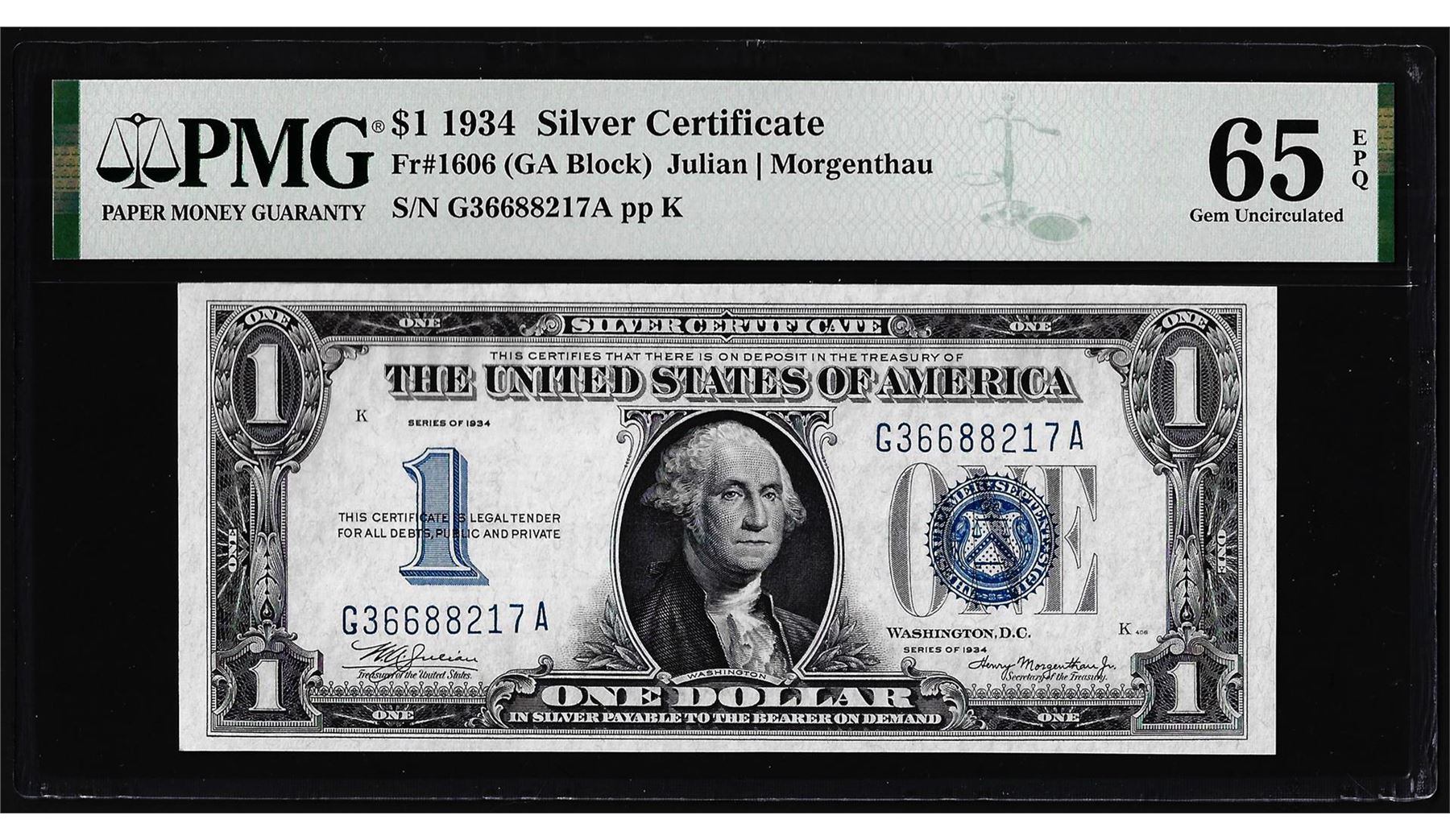 One 1934 $1 Funnyback Silver Certificate Note Fr.1606 PMG Gem Uncirculated 65EPQ. PMG Certified.