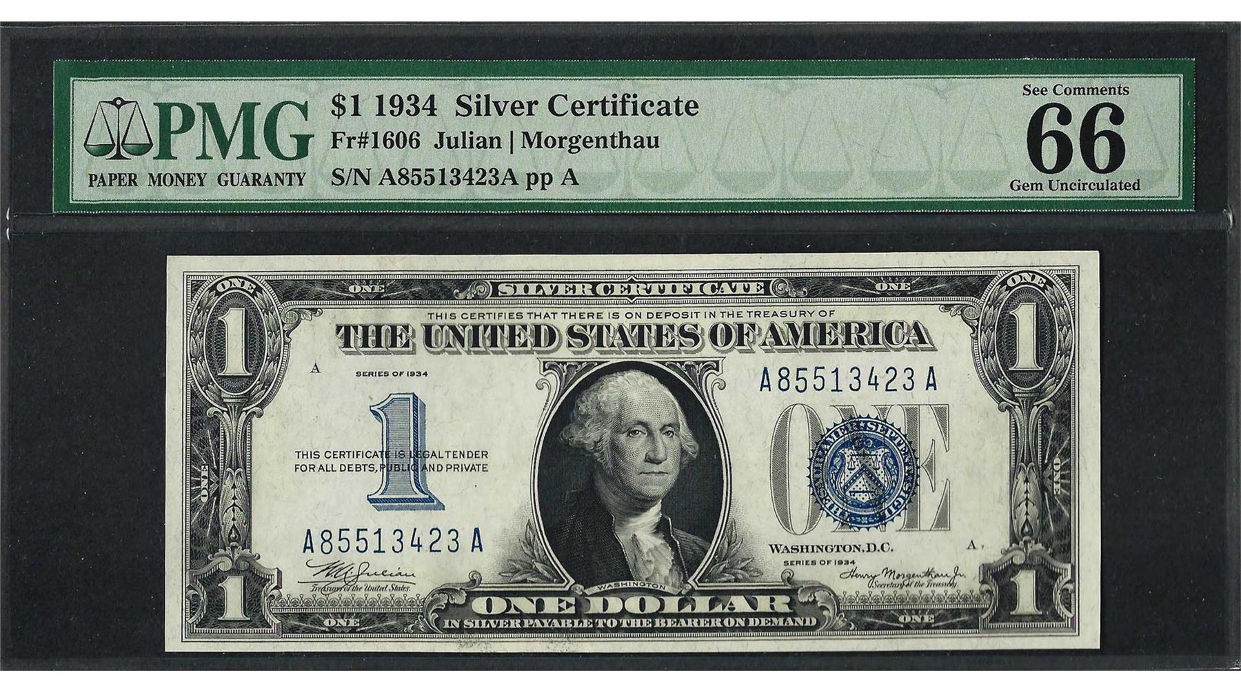 One 1934 $1 Funnyback Silver Certificate Note Fr.1606 PMG Gem Uncirculated 66EPQ. PMG Certified.