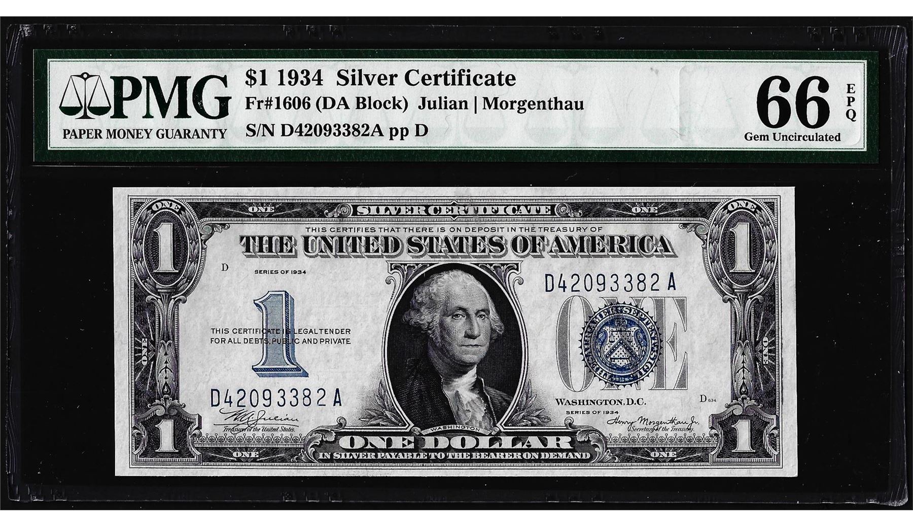 One 1934 $1 Funnyback Silver Certificate Note Fr.1606 PMG Gem Uncirculated 66EPQ. PMG Certified.
