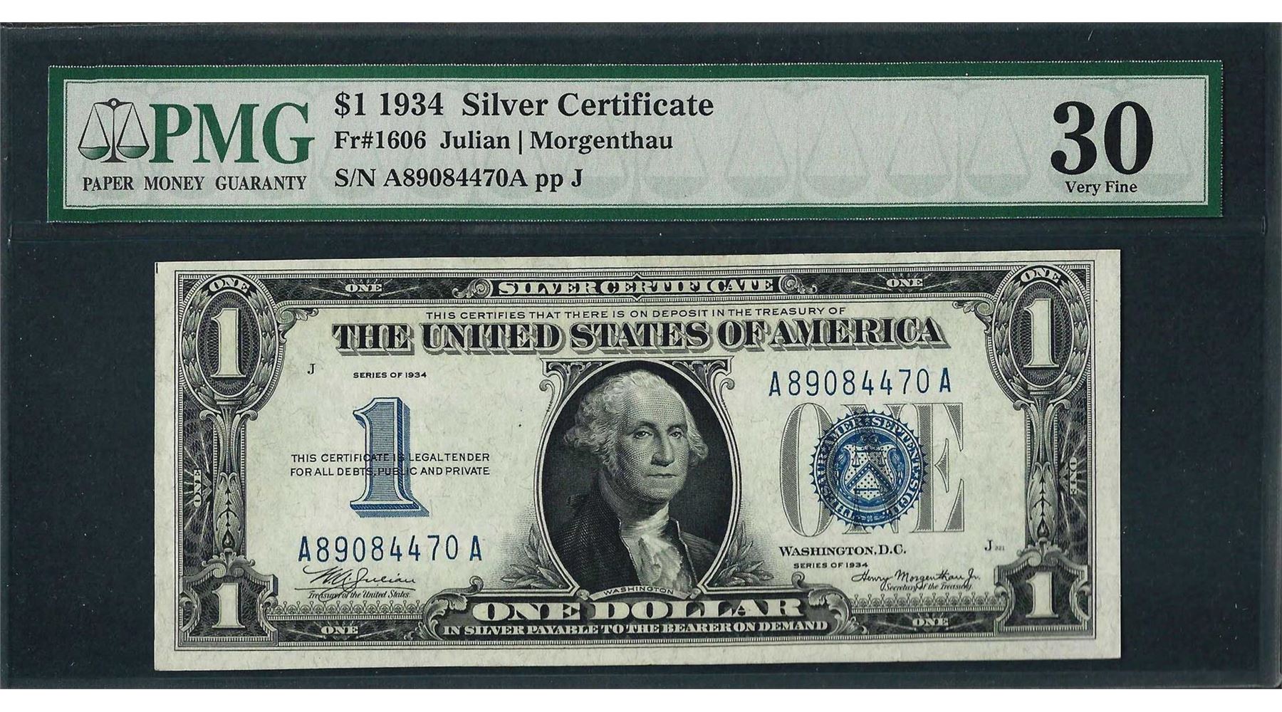 1934 $1 Funnyback Silver Certificate Note Fr.1606 PMG Very Fine 30