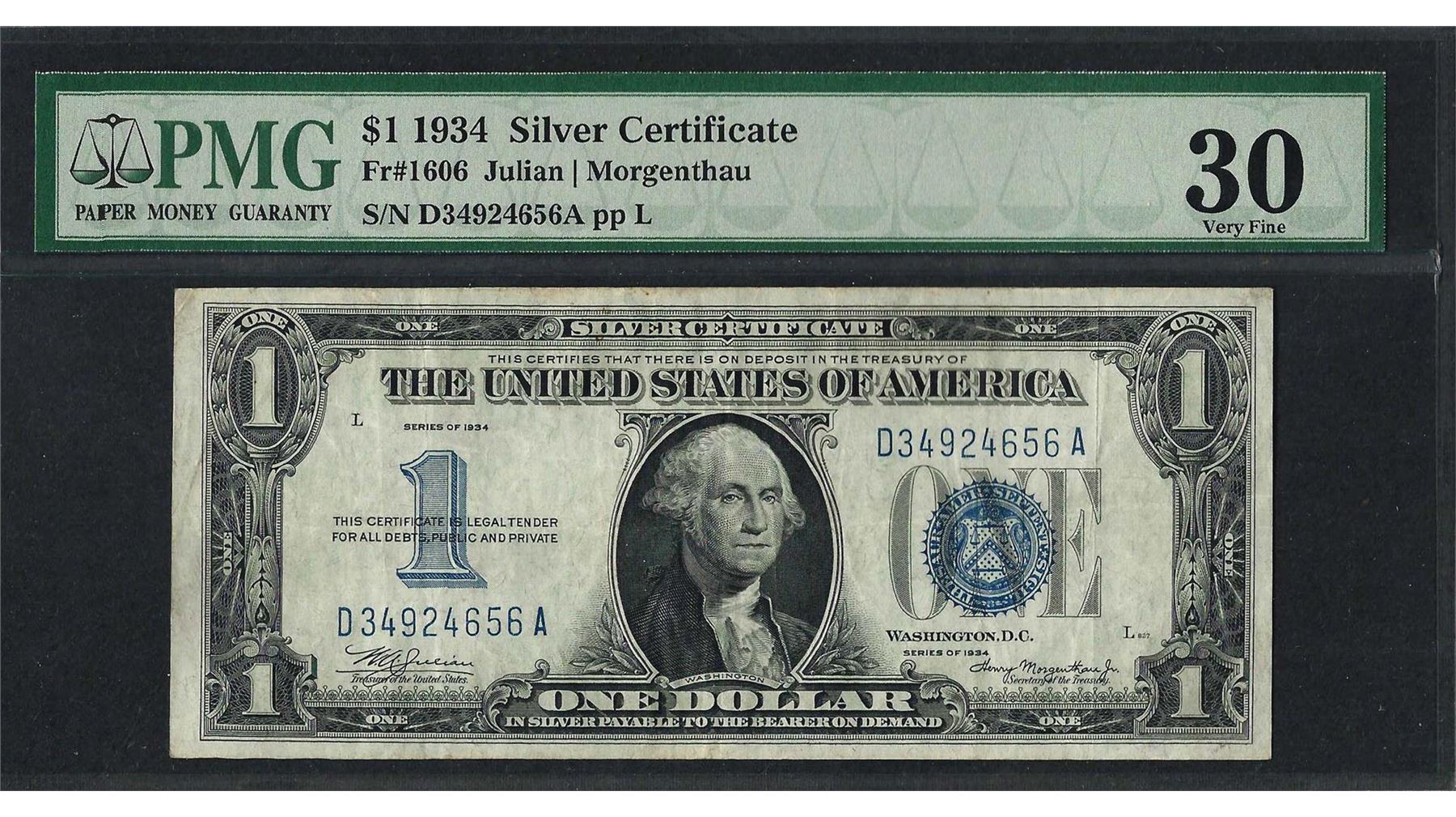 1934 $1 Funnyback Silver Certificate Note Fr.1606 PMG Very Fine 30