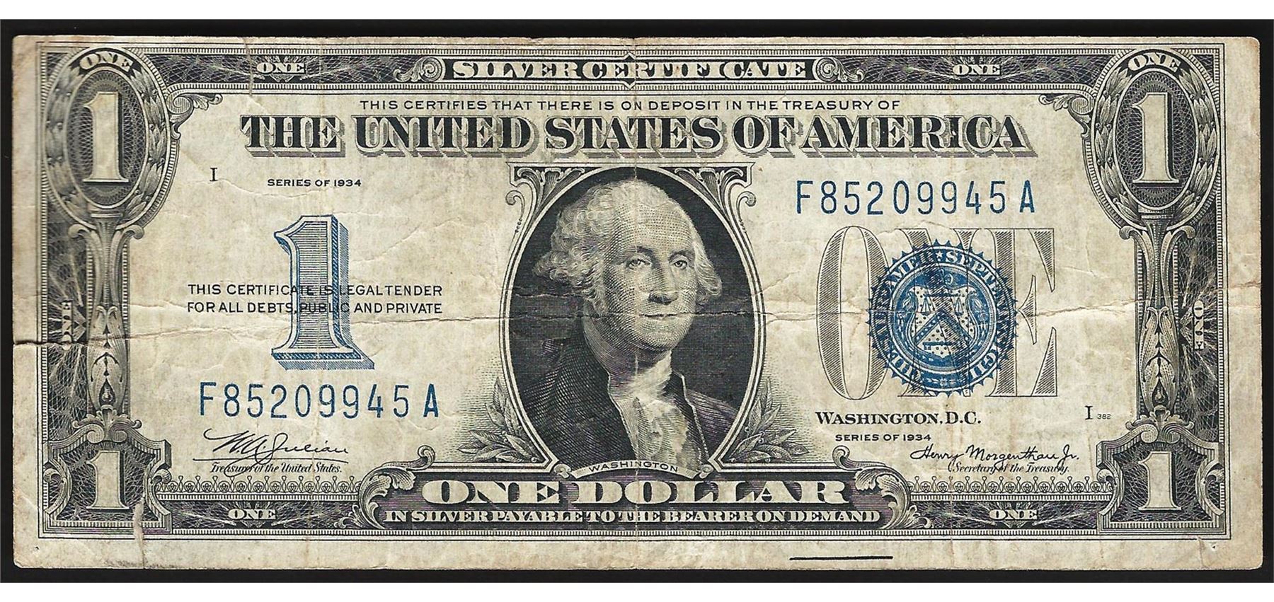 One 1934 $1 Funnyback Silver Certificate Note - Tears.