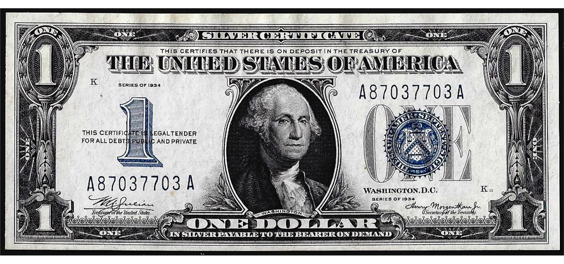 One 1934 $1 Funnyback Silver Certificate Note.
