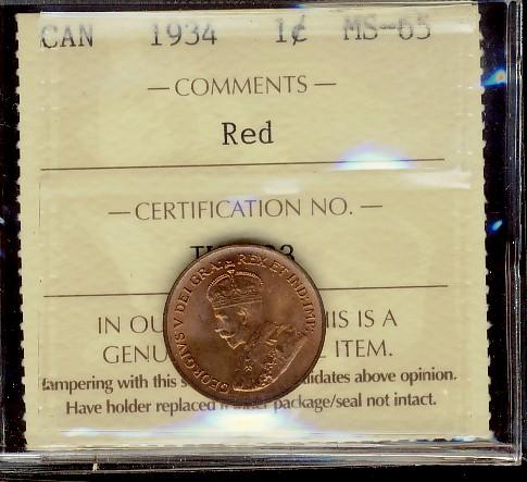 1934 1¢ ICCS MS65 Red, lovely example. Clean surfaces. Flashy!
