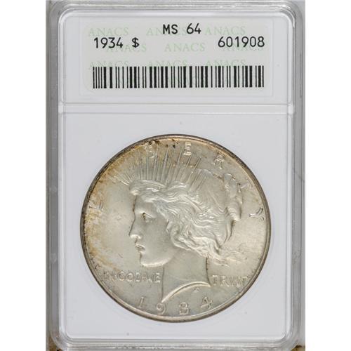 <B>1934 $1 MS64 ANACS.</B></I> NGC Census: (2218/660). PCGS Population (1200/579). Mintage: 954,057. Numismedia Wsl. Price for NGC/PCGS coin in MS64: $380. (#7375)<BR><BR><b>Shipping:</b> Coins & Currency (<a target="_blank" href="http://www.heritageauctions.com/common/shipping.php">view shipping information</a>)