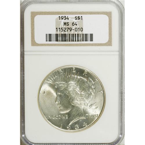 <B>1934 $1 MS64 NGC.</B></I> NGC Census: (1106/331). PCGS Population (1188/572). Mintage: 954,057. Numismedia Wsl. Price for NGC/PCGS coin in MS64: $380. (#7375)<BR><BR><b>Shipping:</b> Coins & Currency (<a target="_blank" href="http://www.heritageauctions.com/common/shipping.php">view shipping information</a>)