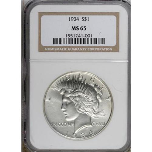 <B>1934 $1 MS65 NGC.</B></I> NGC Census: (303/28). PCGS Population (467/126). Mintage: 954,057. Numismedia Wsl. Price for NGC/PCGS coin in MS65: $700. (#7375)<BR><BR><B>Coin Engraver:</B> Anthony de Francisci<BR><BR><b>Shipping:</b> Coins & Currency (<a target="_blank" href="http://www.heritageauctions.com/common/shipping.php">view shipping information</a>)
