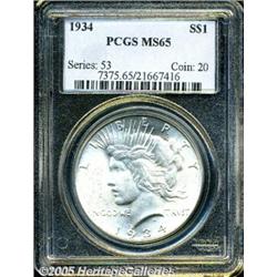 <B>1934<img border='0' src='http://www.heritagecoins.com/images/star.gif' width=10 height=10>$1 MS65 PCGS.</B></I> Lustrous surfaces are brilliant with just a few minute marks.