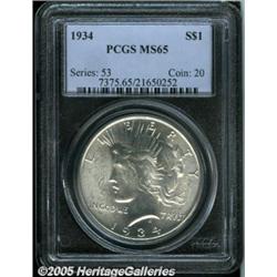 <B>1934<img border='0' src='http://www.heritagecoins.com/images/star.gif' width=10 height=10>$1 MS65 PCGS.</B></I> Nicely struck, with brilliant, minimally abraded surfaces. This piece displays nice overall eye appeal.