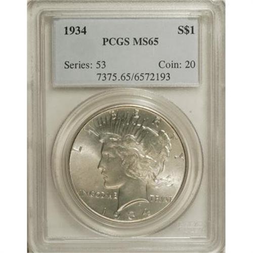<B>1934 $1 MS65 PCGS.</B></I> A captivating Gem example of the last circulation-strike dollar issue to have a mintage of under 1 million pieces. Solidly struck with wonderful luster and only a few tiny marks on the subtly yellow-tinged silver-gray surfaces.<BR><BR><b>Shipping:</b> Coins & Currency (<a target="_blank" href="http://www.heritageauctions.com/common/shipping.php">view shipping information</a>)