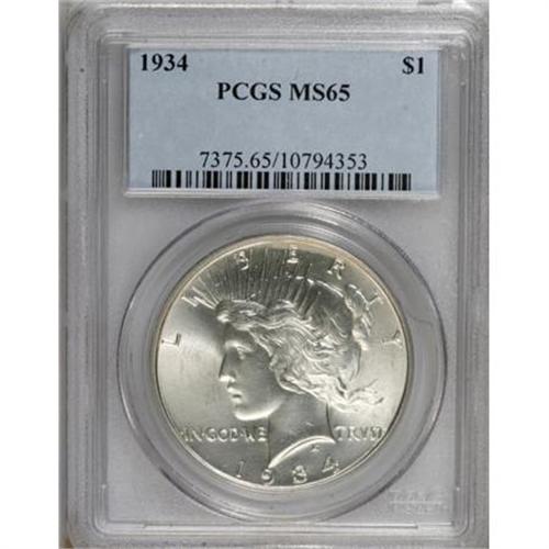 <B>1934 $1 MS65 PCGS.</B></I> A decisively struck and shining silver-white Gem from the short-lived revival of the Peace dollar design. Both sides offer a remarkably clean appearance and show only a handful of stray marks.<BR><BR><B>Coin Engraver:</B> Anthony de Francisci<BR><BR><b>Shipping:</b> Coins & Currency (<a target="_blank" href="http://www.heritageauctions.com/common/shipping.php">view shipping information</a>)