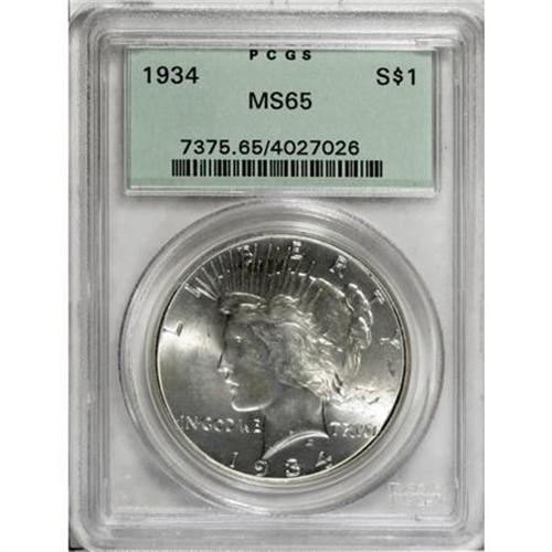 <B>1934 $1 MS65 PCGS.</B></I> The return of the Peace dollar in 1934 was met with minimal fanfare, and Philadelphia struck under a million pieces for the year. This strongly lustrous Gem is predominantly silver-gray with a horizontal band of golden-tan across the center of the obverse.<BR><BR><B>Coin Engraver:</B> Anthony de Francisci<BR><BR><b>Shipping:</b> Coins & Currency (<a target="_blank" href="http://www.heritageauctions.com/common/shipping.php">view shipping information</a>)