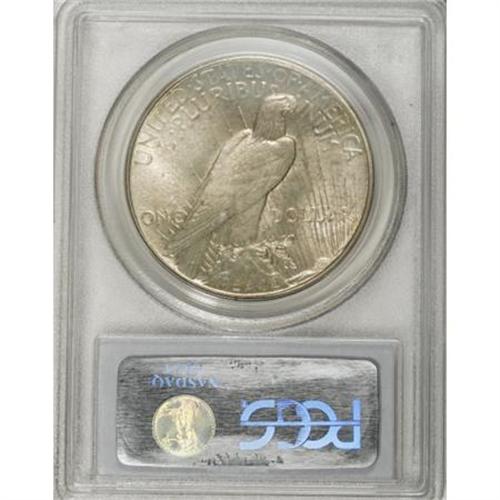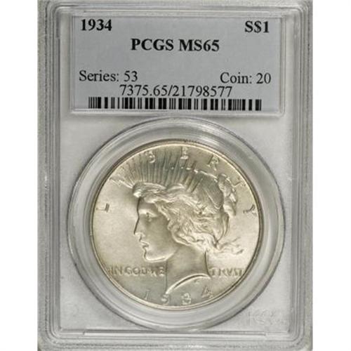 <B>1934 $1 MS65 PCGS.</B></I> Well struck with amazingly clean pearl-gray surfaces that reveal a slight degree of speckled russet patina under magnification. Because they were generally stored in mint bags containing 1,000 coins, it is unusual to find a Peace dollar with nearly unmarked surfaces, such as this one. A lovely, satiny Gem from the final year of the series. <BR><I>From The Arnold & Harriet Collection, Part Two.</B></I><BR><BR><B>Coin Engraver:</B> Anthony de Francisci<BR><BR><b>Shipping:</b> Coins & Currency (<a target="_blank" href="http://www.heritageauctions.com/common/shipping.php">view shipping information</a>)