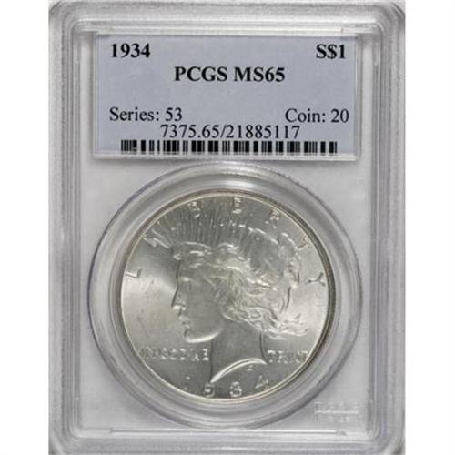 <B>1934 $1 MS65 PCGS.</B></I> Satiny and fully struck with exceptionally clean surfaces. A brilliant example of this scarce, late-date Peace dollar.<BR><BR><B>Coin Engraver:</B> Anthony de Francisci<BR><BR><b>Shipping:</b> Coins & Currency (<a target="_blank" href="http://www.heritageauctions.com/common/shipping.php">view shipping information</a>)