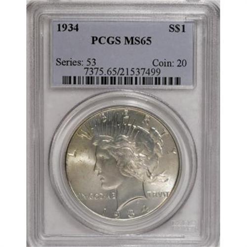 <B>1934 $1 MS65 PCGS.</B></I> This highly lustrous Gem has an above-average strike. Aside from a few spots of dark toning at the eagle's neck and wings, the surfaces are largely untoned.<BR><BR><B>Coin Engraver:</B> Anthony de Francisci<BR><BR><b>Shipping:</b> Coins & Currency (<a target="_blank" href="http://www.heritageauctions.com/common/shipping.php">view shipping information</a>)