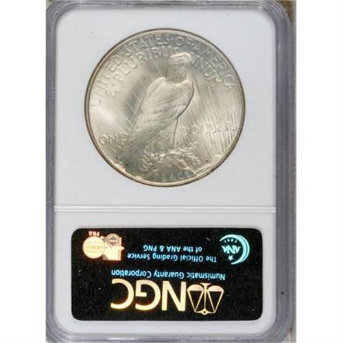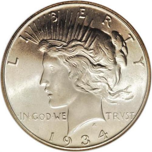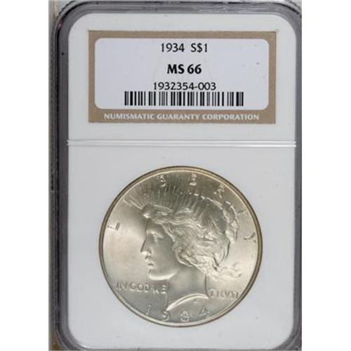 <B>1934 $1 MS66 NGC.</B></I> This low mintage Peace dollar has scintillating cartwheel luster and light to medium tawny-gold toning. No marks are visible with the unaided eye, and even a loupe reveals only trivial imperfections. After a six-year gap, mintages of silver dollars briefly resumed in 1934, to conform to the Silver Purchase Act of June 19, 1934. Census: 24 in 66, 4 finer (10/07).<BR><BR><B>Coin Engraver:</B> Anthony de Francisci<BR><BR><b>Shipping:</b> Coins & Currency (<a target="_blank" href="http://www.heritageauctions.com/common/shipping.php">view shipping information</a>)