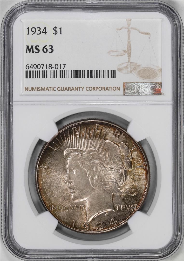 One 1934 $1 Peace Dollar Silver Coin NGC MS63 Nice Toning. NGC Certified.