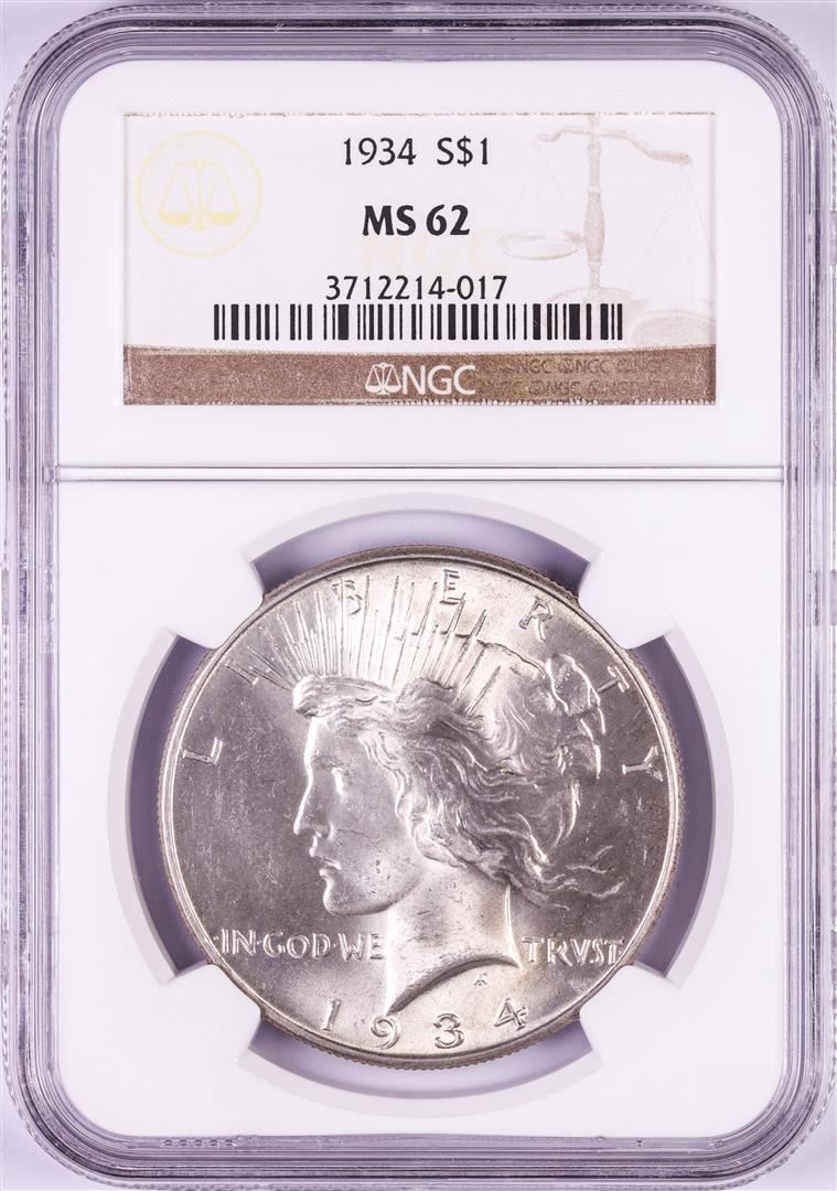 One 1934 $1 Peace Silver Dollar Coin NGC MS62. NGC Certified.