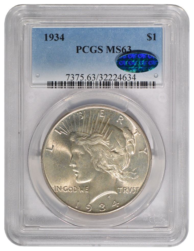 One 1934 $1 Peace Silver Dollar Coin PCGS CAC.
