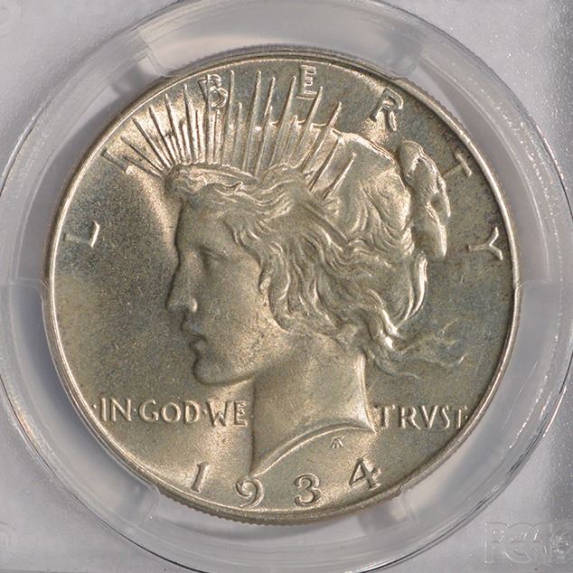 One 1934 $1 Peace Silver Dollar Coin PCGS MS63 CAC.