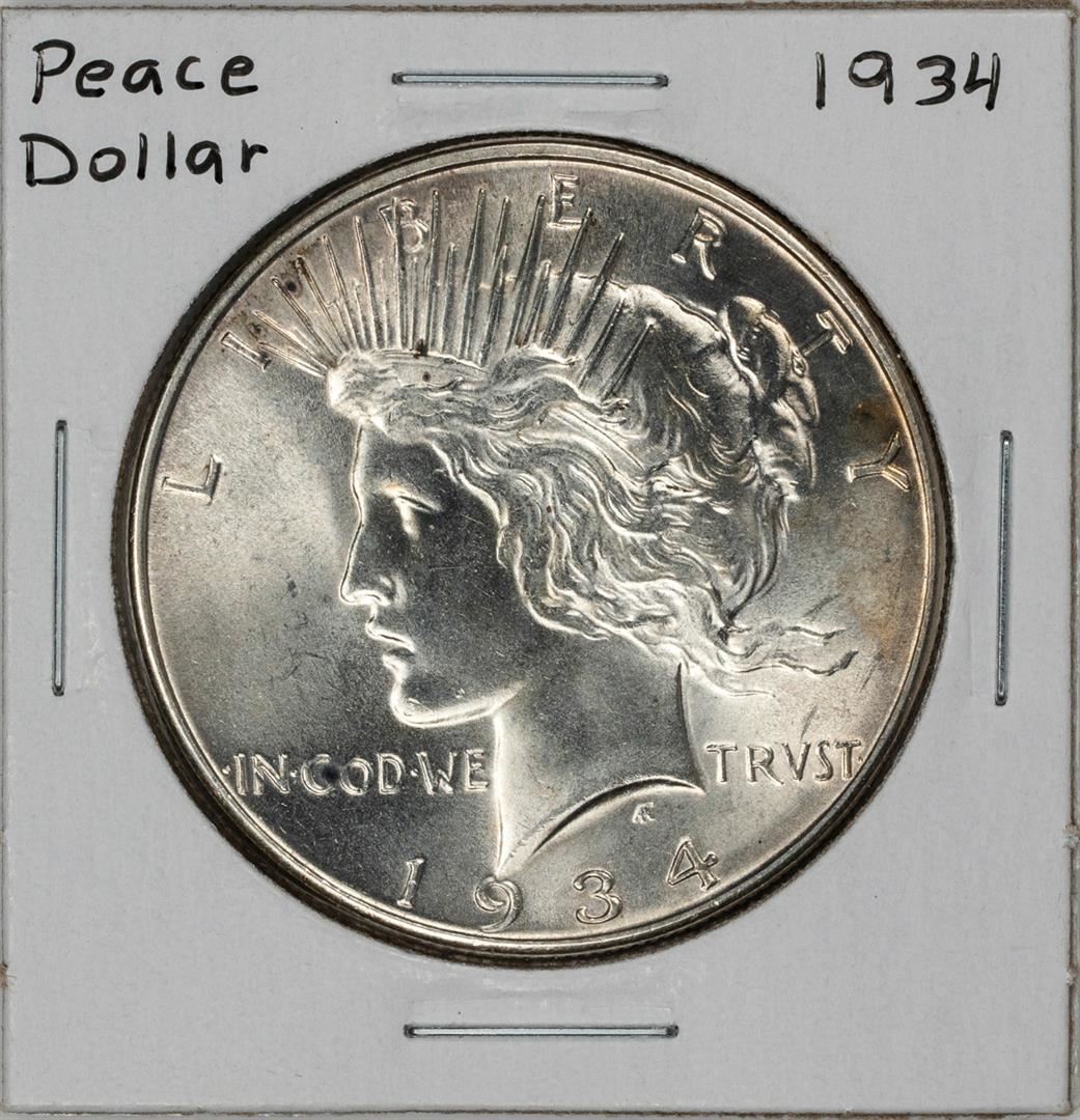 One 1934 $1 Peace Silver Dollar Coin.