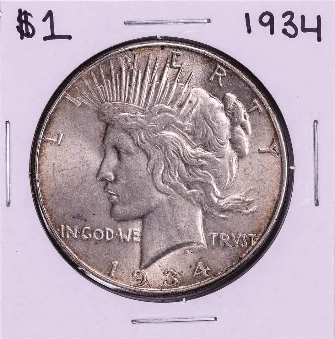 One 1934 $1 Peace Silver Dollar Coin.