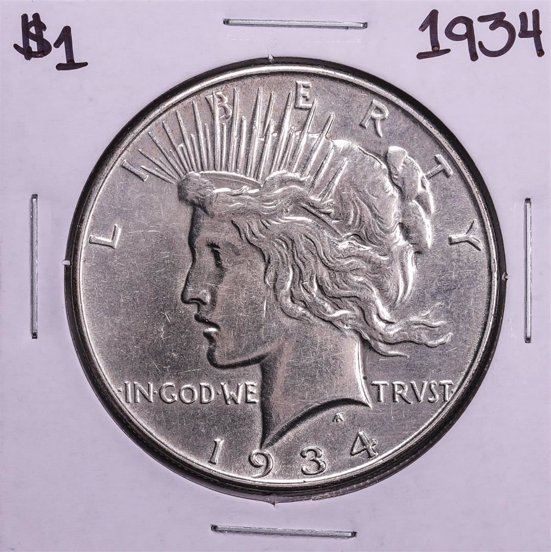 One 1934 $1 Peace Silver Dollar Coin.