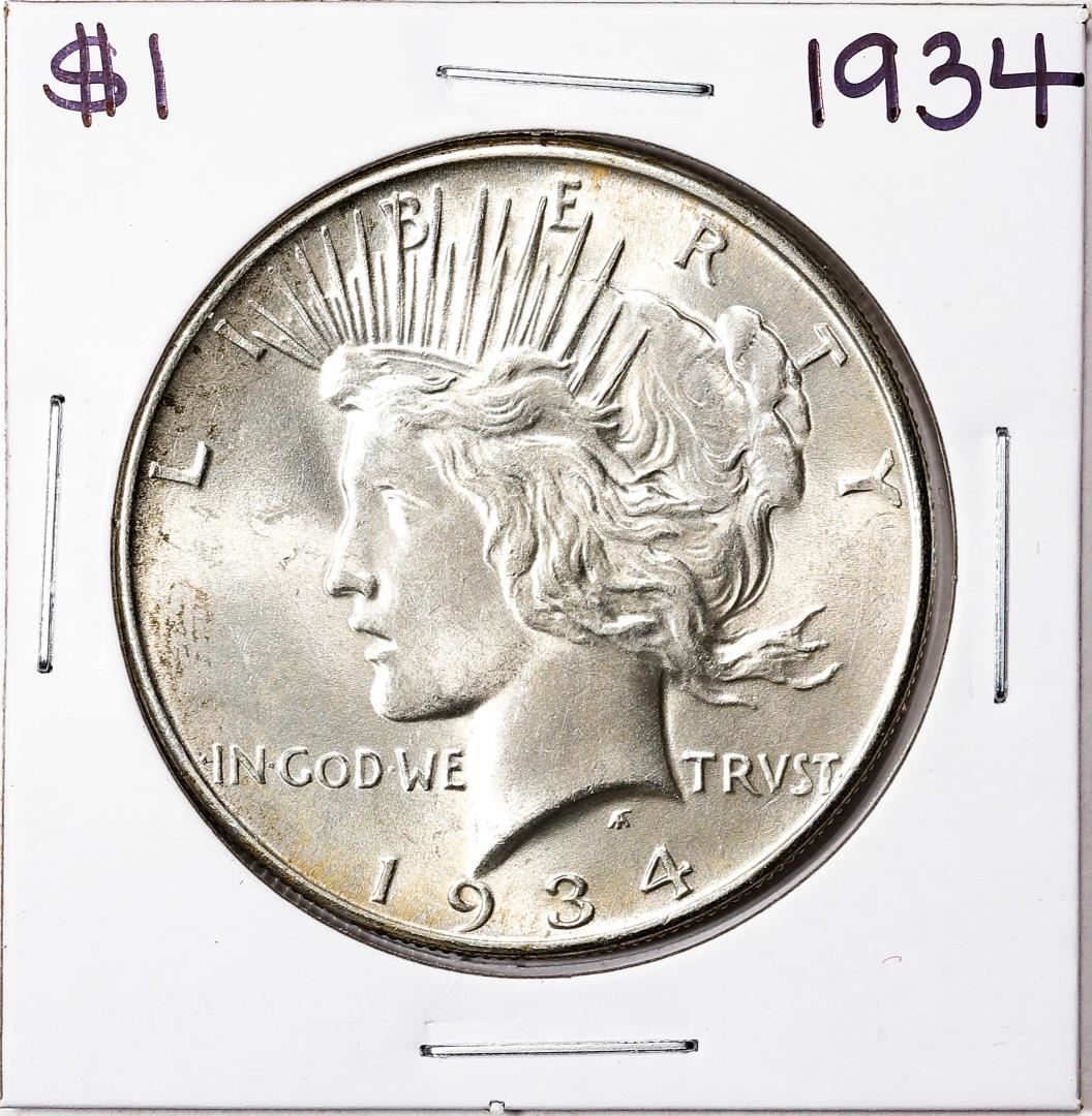 One 1934 $1 Peace Silver Dollar Coin.