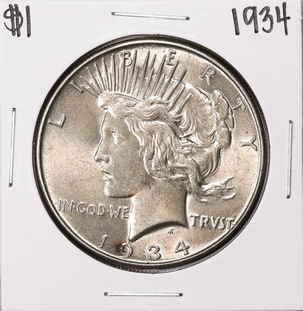 One 1934 $1 Peace Silver Dollar Coin.