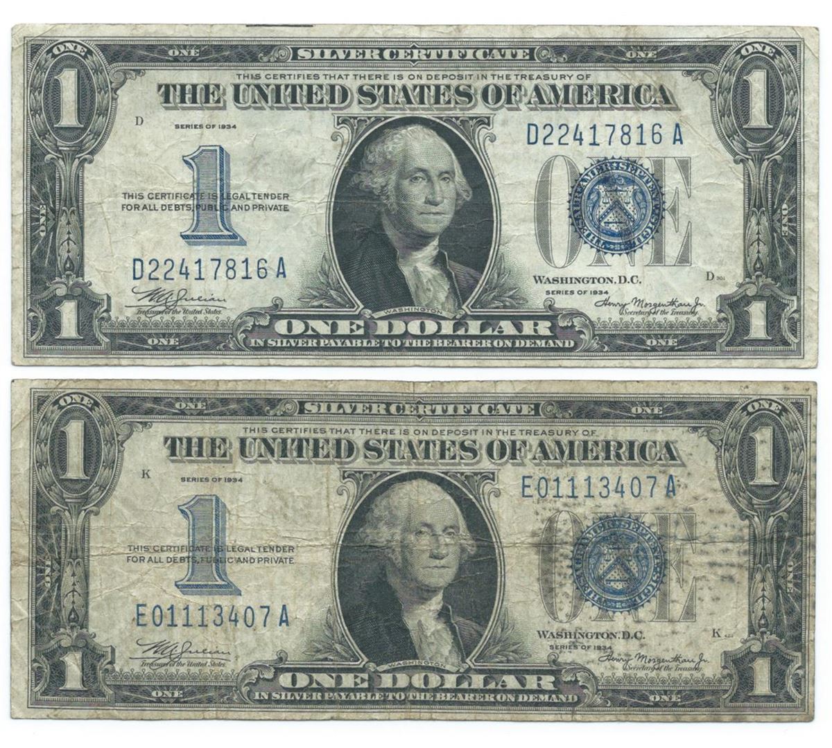 One 1934 $1 Silver Certificate Currency Lot of 2.
