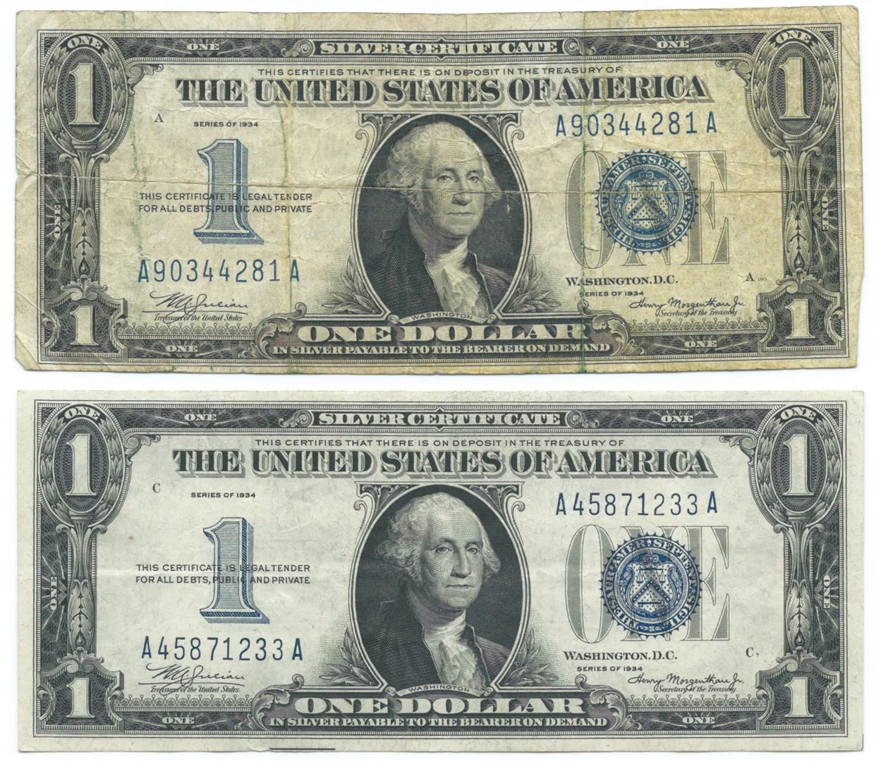 One 1934 $1 Silver Certificate Currency Lot of 2.
