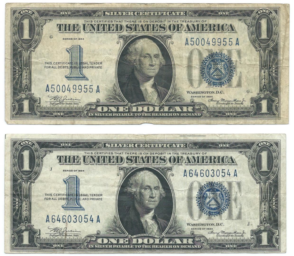 One 1934 $1 Silver Certificate Currency Lot of 2.