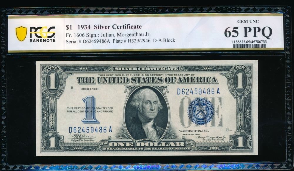 One 1934 $1 Silver Certificate PCGS 65PPQ.