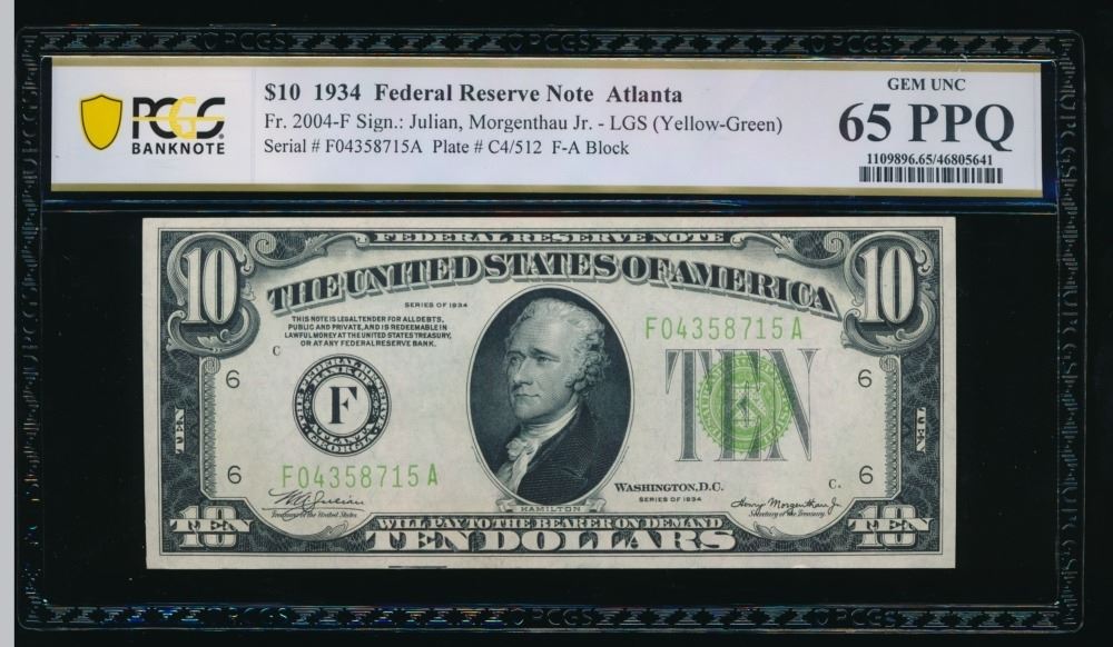 One 1934 $10 Atlanta FRN PCGS 65PPQ.