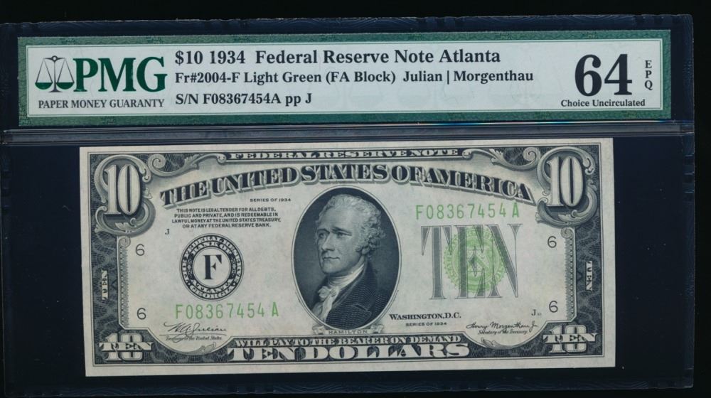 One 1934 $10 Atlanta Federal Reserve Note PMG 64EPQ.
