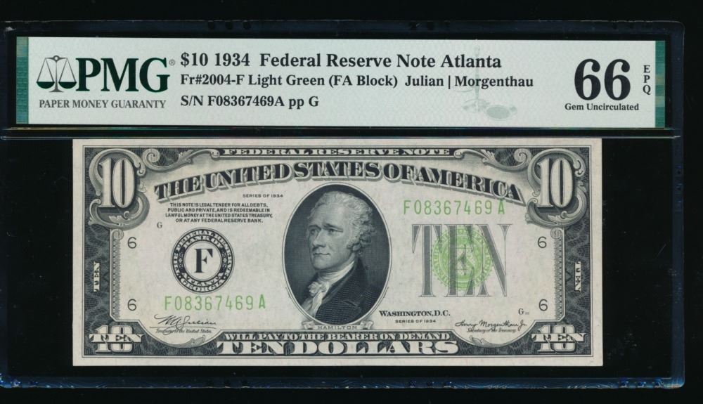 One 1934 $10 Atlanta Federal Reserve Note PMG 66EPQ.