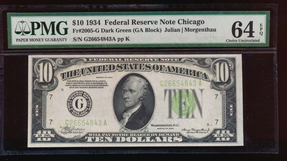 One 1934 $10 Chicago Federal Reserve Note PMG 64EPQ.