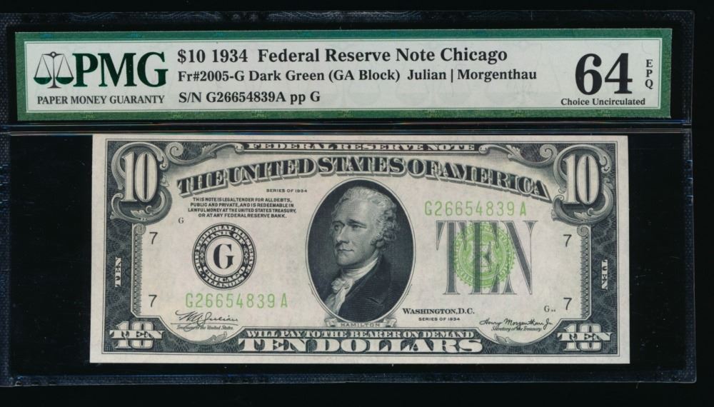 One 1934 $10 Chicago Federal Reserve Note PMG 64EPQ.